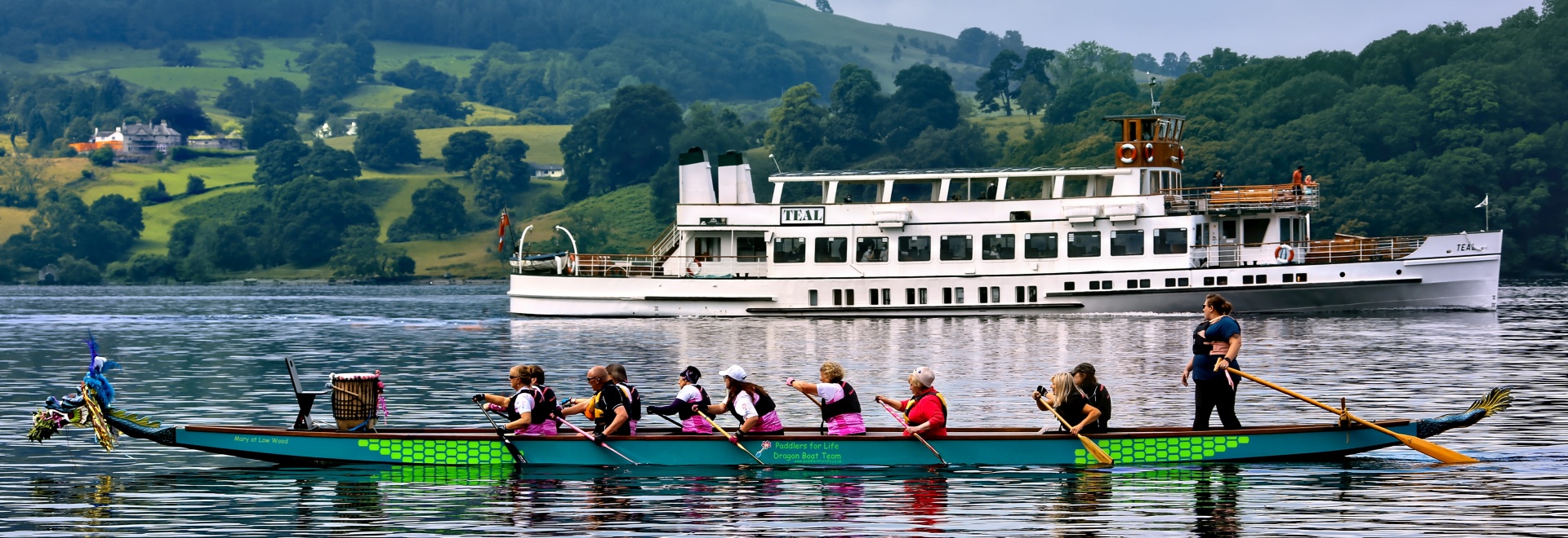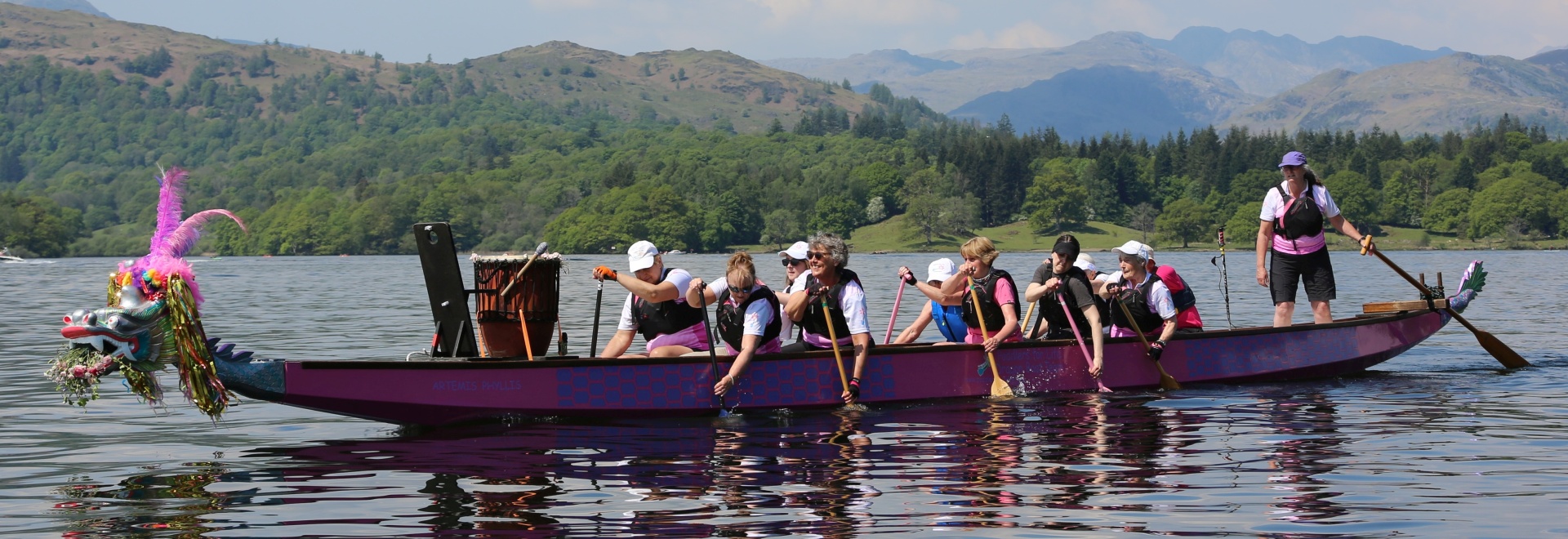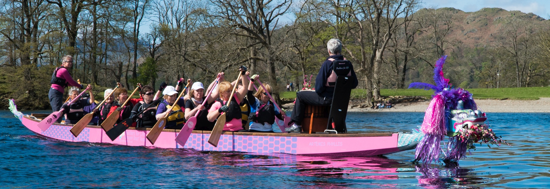 We paddle dragon boats on Windermere at Low Wood Bay near Ambleside in Cumbria, UK. This exercise helps health and wellbeing both during and after treatment and also ameliorates some of the effects of treatment such as lymphoedema and tiredness. The friendship, shared experience and team spirit of paddling can be extremely supportive after a cancer diagnosis.