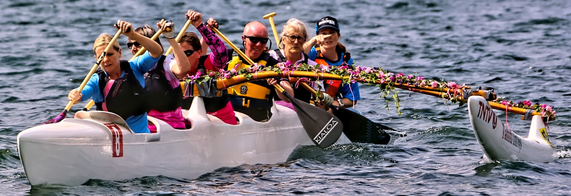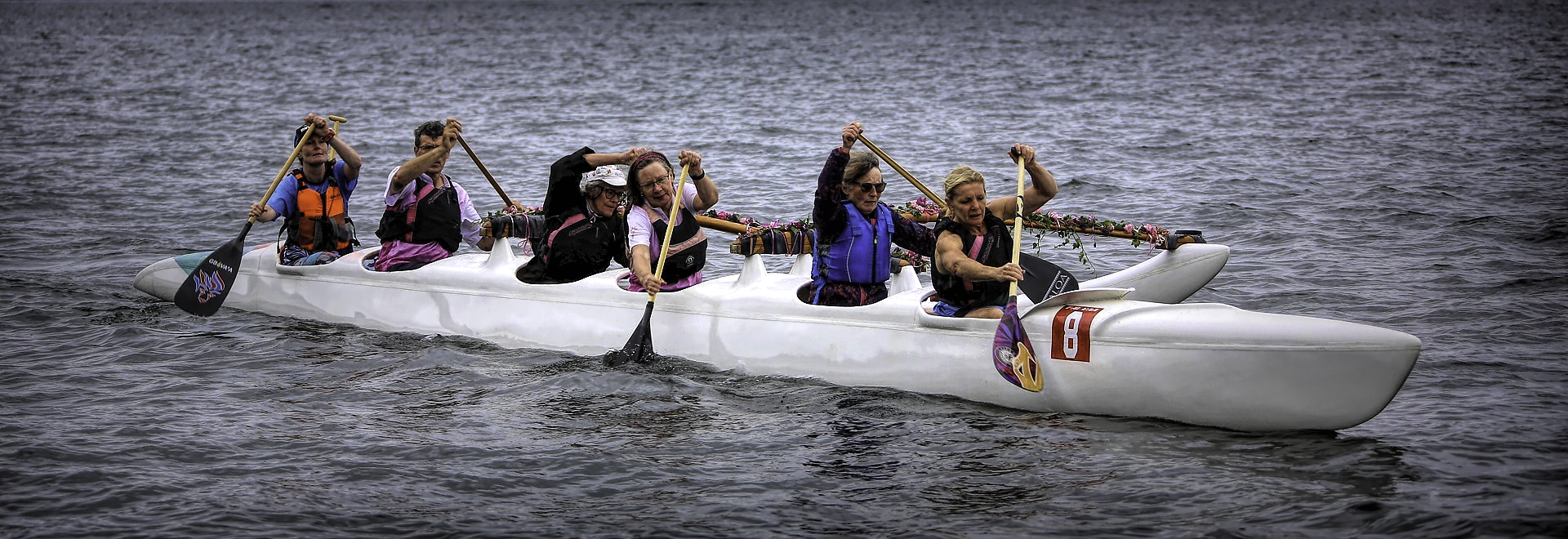 A team of cancer survivors, primarily breast cancer, paddling dragon boats.